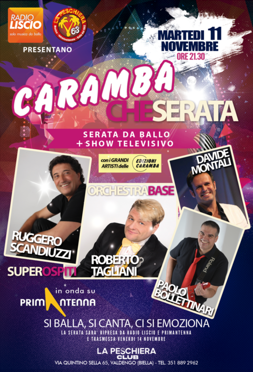 Martedì 11 novembre, alla Peschiera di Valdengo (Biella), si accende una serata speciale dedicata alla musica da ballo e allo spettacolo televisivo: "Caramba Che Serata". Un evento unico che unisce il calore della tradizione musicale con l’energia di uno show dal vivo, realizzato e prodotto da Radio Liscio e trasmesso (venerdì 14) su Primantenna.